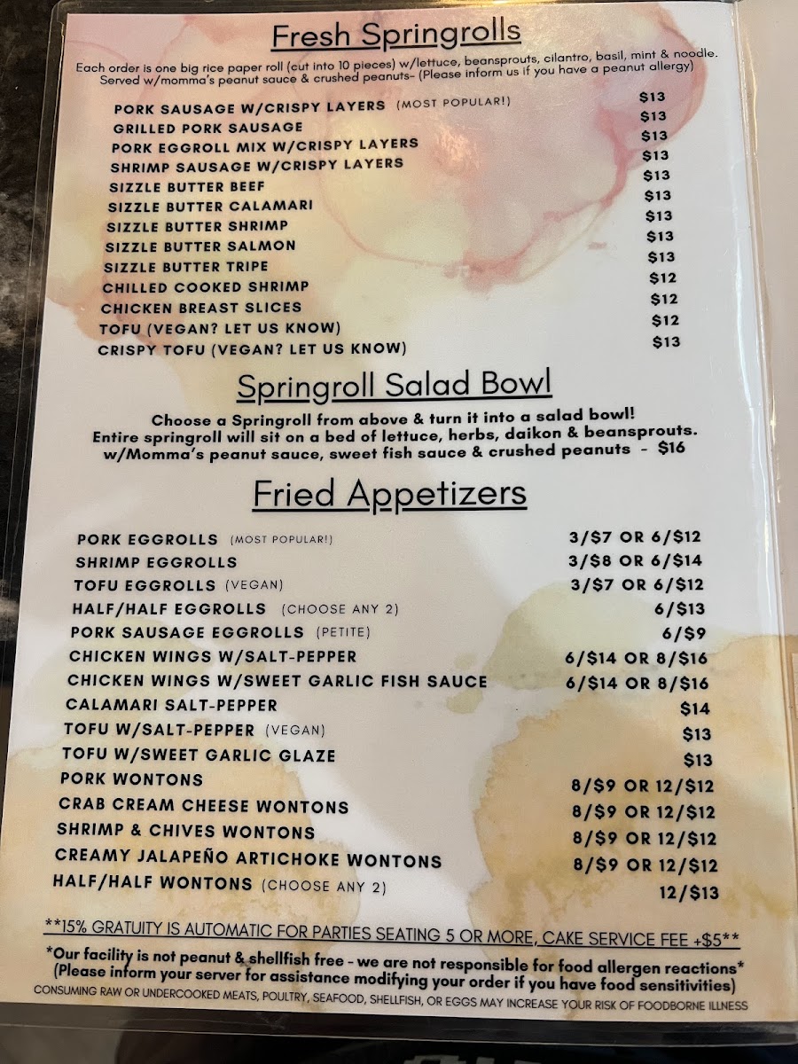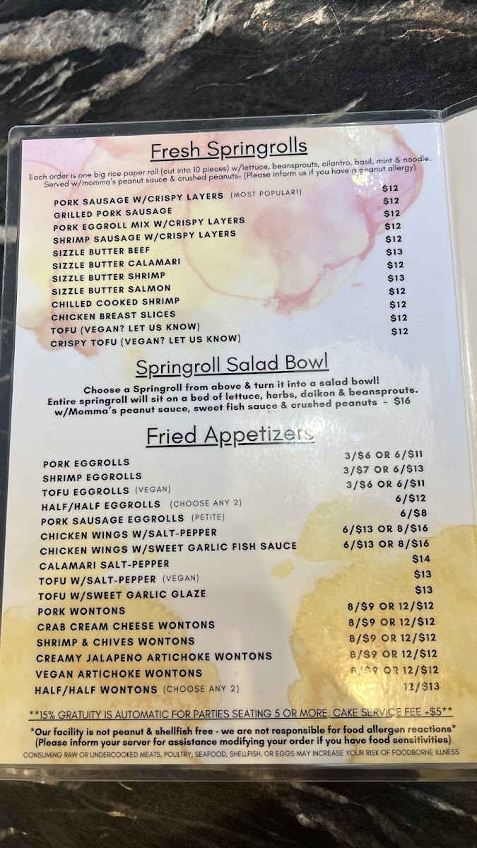 For those seeking plant-based options, Pho Momma presents a variety of vegan choices, from spring rolls to tofu pho, ensuring comfort and flavor are accessible to all. Overall, the menu supports a dining experience that is familiar yet thoughtfully presented, fitting well with the restaurant’s cozy environment and attentive service.