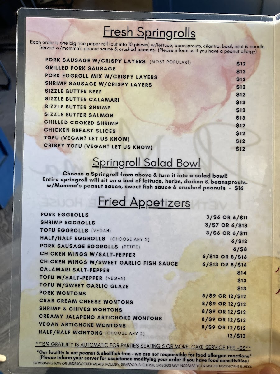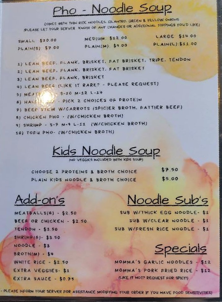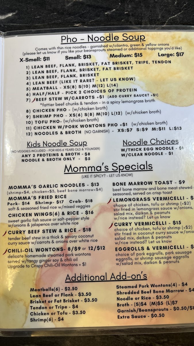 The menu at Pho Momma offers a thoughtfully curated selection of Vietnamese favorites, bridging comforting classics with casual dining ease. From steaming bowls of beef pho enriched with fresh herbs to crispy pork spring rolls, the dishes invite moments of relaxed enjoyment whether you're stopping by for a quick lunch or settling in for a comforting dinner.